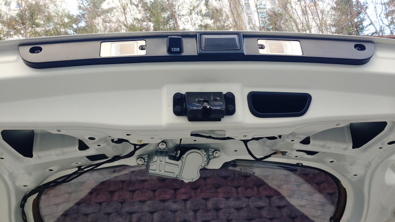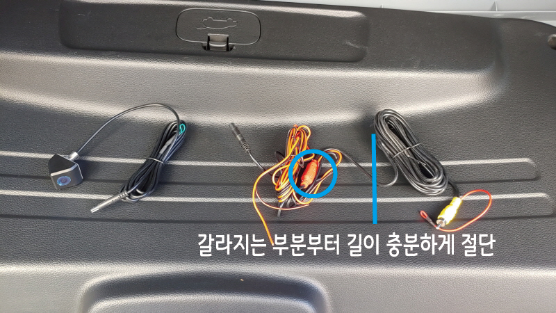 가니쉬에 후방카메라를 잘 고정하고 가니쉬를 원위치에 부착 후, 카메라에 붙어있는 전선을 기존 배선이 잘라진 곳까지 끌어간다.